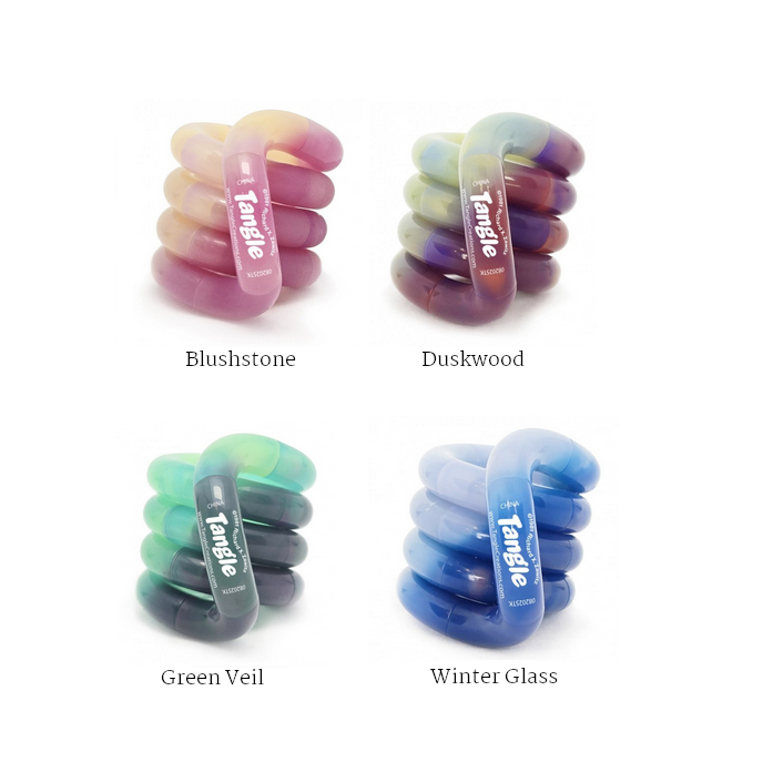 Diese Tangle-Variante gibt es in 4 verschiedenen Designs. Auf dem Produktbild von oben links nach unten rechts: Blushstone, Duskwood, Green Veil und Winter Glass.